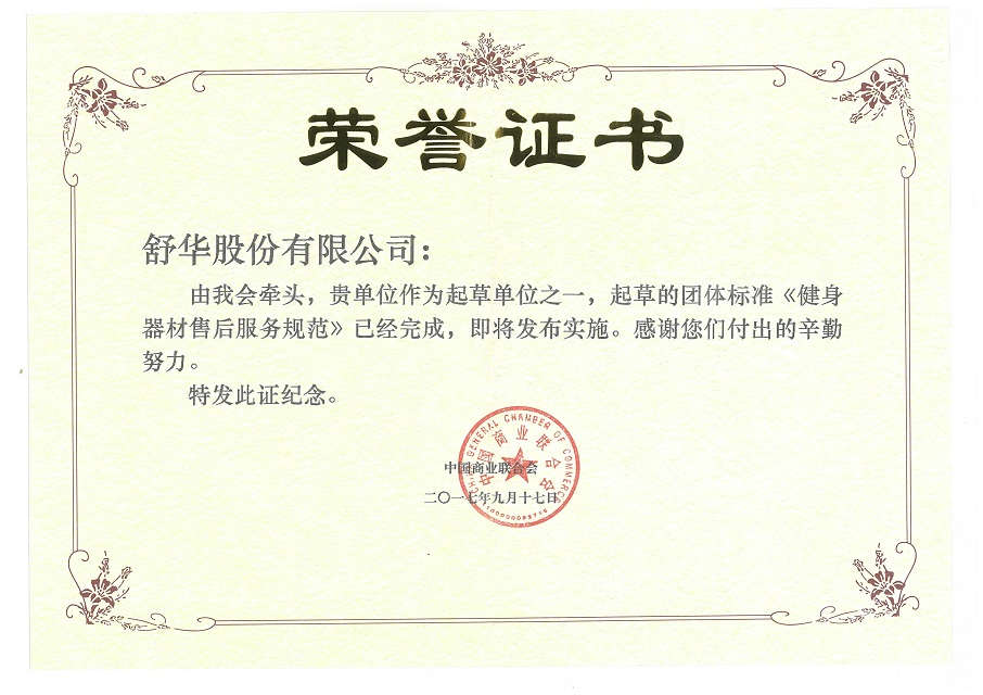 From 2017 to 2018, Shuhua was named the "Top 10 Enterprise of Body Building Equipment Industry in China Light Industries " for the second consecutive year. In 20